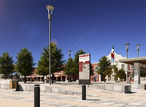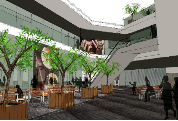 En el centro de la ciudad de Toluca se proyecta la edificación de un centro comercial que coadyuve a un reposicionamiento de esta zona. La propuesta es de un edificio que se integra a los Portales donde se localiza, su ubicación en esquina permite plantear en planta baja un patio que une las dos aceras generando un espacio integrado a la circulación peatonal convirtiéndolo en espacio público, este patio está al aire libre y cuenta con una cubierta retráctil que permite ser usado en cualquier momento independientemente del clima que haya. El centro comercial está integrado por dos niveles subterráneos de estacionamiento y tres niveles comerciales, su expresión formal integra los Portales con un edificio contemporáneo.